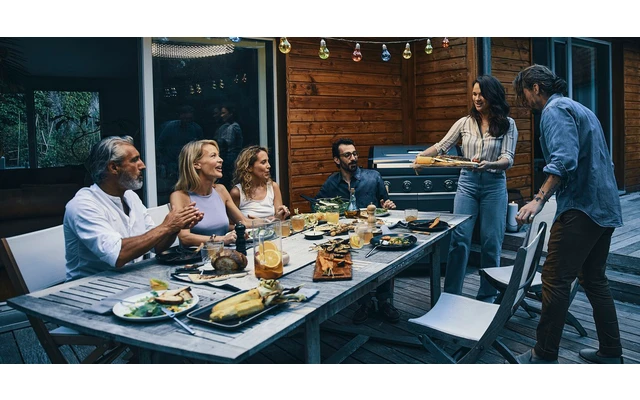 L’eau peut s’évaporer pendant le processus de cuisson, ce qui empêche la graisse et les résidus alimentaires de brûler dans le bac et vous évite de devoir frotter après le barbecue. Le réservoir d’eau sale, y compris le filtre, permet de séparer l’eau des éléments solides pour une élimination encore plus facile. Les tables latérales Push2Fold constituent un système de table d’appoint robuste et durable avec un mécanisme de pliage amélioré pour un rangement peu encombrant. Le barbecue est également équipé de deux grilles de maintien au chaud de 35 x 17 cm chacune, d’un allumage électronique, d’un couvercle en acier et en aluminium, de quatre roues et de deux freins de stationnement pour faciliter le transport.