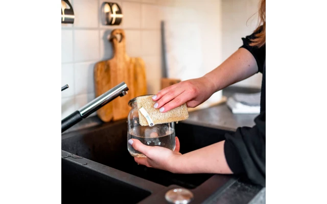 Avant le rinçage, humidifie l’éponge sèche en loofah avec de l’eau, ce qui la rendra toute douce et lui permettra d’atteindre sa taille optimale pour l’utilisation. Après utilisation, rince ton éponge de cuisine à l’eau claire et suspends-la à la boucle pour la faire sécher. Si l’éponge n’est pas utilisée, range-la dans un endroit sec. Après plusieurs utilisations, les éponges de vaisselle doivent être lavées dans le lave-linge ou le lave-vaisselle – elles sont ainsi à nouveau propres et peuvent être utilisées beaucoup plus longtemps que les éponges en plastique traditionnelles qui sentent mauvais. Si tu utilises les éponges de nettoyage tous les jours, tu devrais les remplacer après 4 à 6 semaines pour un résultat optimal, malgré un entretien et un lavage réguliers.