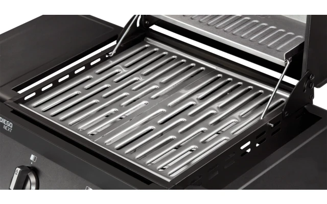 TROP D’ESPACE POUR ÊTRE PETIT. Les BBQ de la classe SAN DIEGO NEXT ont subi une cure de jouvence en matière de design. Désormais, ils ne sont pas seulement des merveilles de la culture du barbecue, mais aussi un plaisir pour les yeux encore plus grand qu’auparavant. Les modèles disponibles avec deux ou quatre brûleurs offrent des surfaces de préparation et de rangement généreuses, mais n’occupent que le minimum d’espace. Des conditions idéales pour les petites terrasses, les mini-balcons ou les rendez-vous crépitants. Les supports sont robustes et disposent d’une grande étagère pour les assiettes et les grillades, ainsi que de deux autres sur les côtés, par exemple pour les épices ou les sauces. Une grille de maintien au chaud en acier inoxydable oscille en douceur à l’ouverture et à la fermeture du couvercle. Et la grille de cuisson, également en acier inoxydable résistant, se nettoie très facilement après la session de cuisson. Et puisque nous parlons de propreté : Le design noir mat et épuré du barbecue à gaz à brûleurs en acier inoxydable s’intègre parfaitement dans toutes les ambiances possibles et imaginables.
