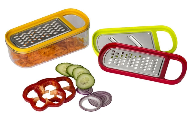 Boîte à râpe pratique avec 3 accessoires différents et inoxydables. Empilable.