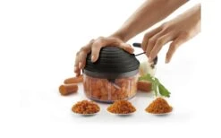 Le hachoir Rotomac est doté d’un mécanisme de traction facile à utiliser et de lames rotatives tranchantes qui coupent les légumes, les fruits et les noix, du plus gros au plus fin, ou les réduisent en sauces et dips.