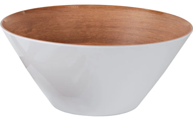 Saladier en aspect bois à l’intérieur et blanc à l’extérieur. Matériau : 100% mélamine.